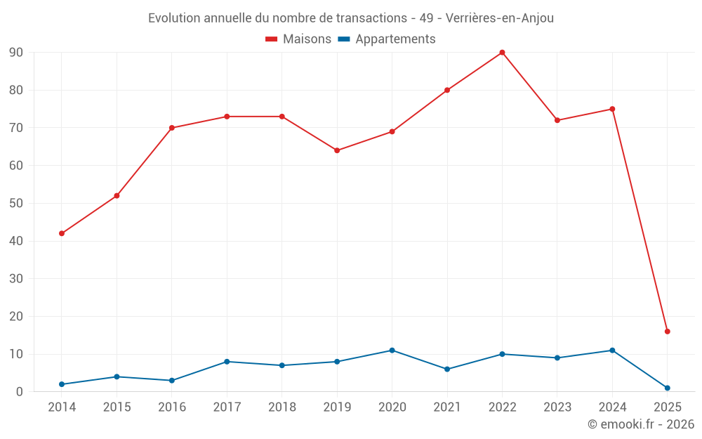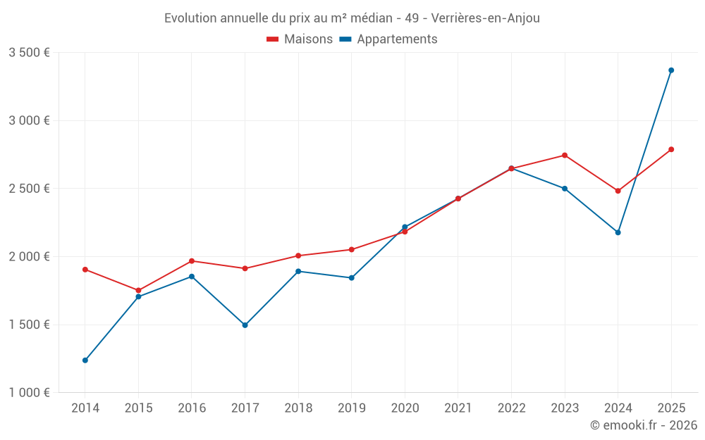 Le prix médian sur les 66 transactions de maisons des 12 derniers mois dans la commune de Verrières-en-Anjou était de 2 497 € par mètre carré pour une valeur foncière médiane de 241 070 €. Sur cette période 60% des transactions se sont situées entre 2 148 et 3 053 € par mètre carré (du 2ème au 8ème déciles).
