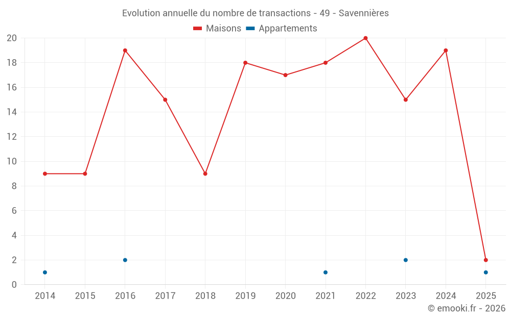 Le prix médian sur les 26 transactions de maisons des 24 derniers mois dans la commune de Savennières était de 2 491 € par mètre carré pour une valeur foncière médiane de 234 500 €. Sur cette période 60% des transactions se sont situées entre 1 914 et 3 019 € par mètre carré (du 2ème au 8ème déciles).