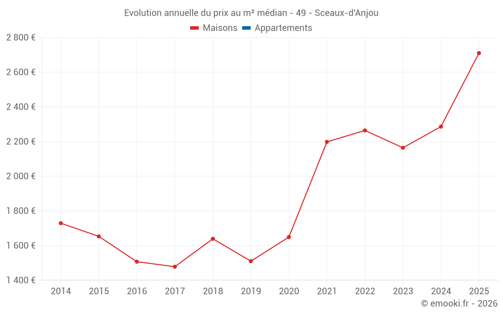 Le prix médian sur les 17 transactions de maisons des 24 derniers mois dans la commune de Sceaux-d'Anjou était de 2 416 € par mètre carré pour une valeur foncière médiane de 235 000 €. Sur cette période 60% des transactions se sont situées entre 1 818 et 2 622 € par mètre carré (du 2ème au 8ème déciles).