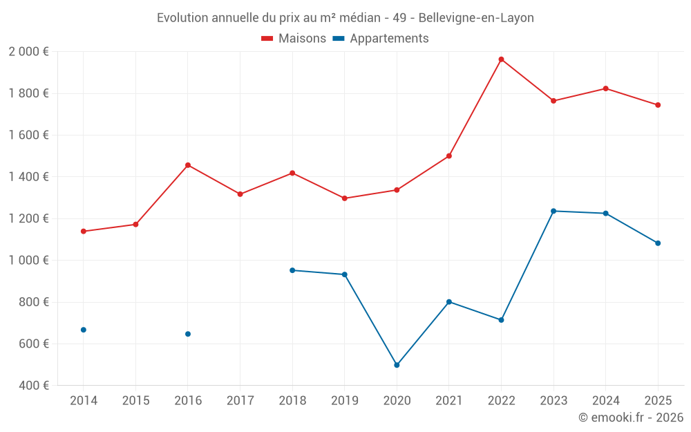 Le prix médian sur les 54 transactions de maisons des 12 derniers mois dans la commune de Bellevigne-en-Layon était de 1 786 € par mètre carré pour une valeur foncière médiane de 158 500 €. Sur cette période 60% des transactions se sont situées entre 1 072 et 2 260 € par mètre carré (du 2ème au 8ème déciles).