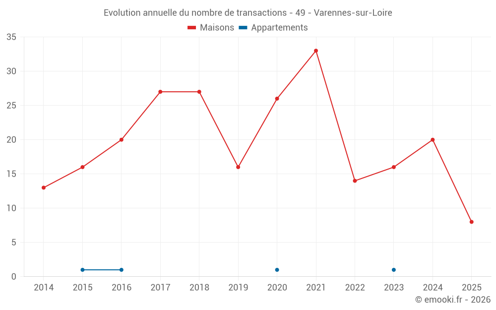 Le prix médian sur les 20 transactions de maisons des 12 derniers mois dans la commune de Varennes-sur-Loire était de 1 796 € par mètre carré pour une valeur foncière médiane de 166 000 €. Sur cette période 60% des transactions se sont situées entre 954 et 2 398 € par mètre carré (du 2ème au 8ème déciles).