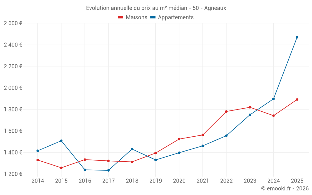 Le prix médian sur les 19 transactions de maisons des 6 derniers mois dans la commune d'Agneaux était de 1 892 € par mètre carré pour une valeur foncière médiane de 180 000 €. Sur cette période 60% des transactions se sont situées entre 1 441 et 2 358 € par mètre carré (du 2ème au 8ème déciles).