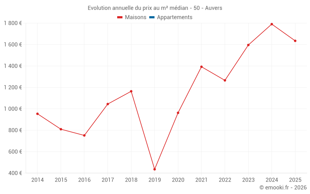 Le prix médian sur les 20 transactions de maisons des 24 derniers mois dans la commune d'Auvers était de 1 751 € par mètre carré pour une valeur foncière médiane de 197 750 €. Sur cette période 60% des transactions se sont situées entre 1 347 et 2 264 € par mètre carré (du 2ème au 8ème déciles).