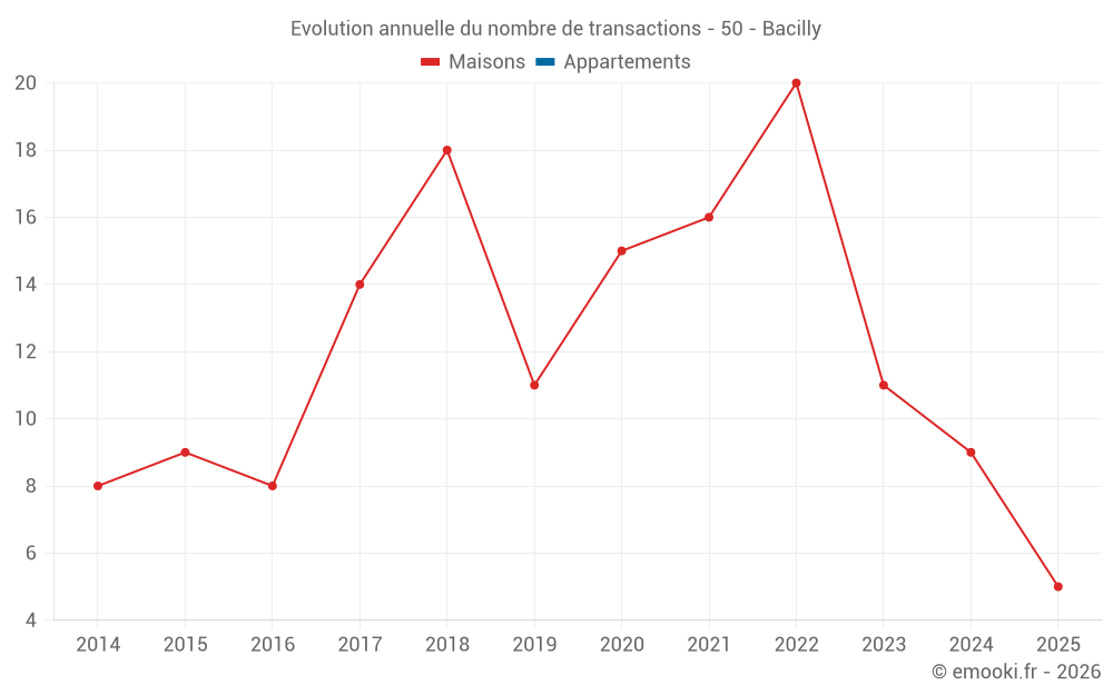 Le prix médian sur les 22 transactions de maisons des 24 derniers mois dans la commune de Bacilly était de 1 813 € par mètre carré pour une valeur foncière médiane de 206 735 €. Sur cette période 60% des transactions se sont situées entre 1 142 et 2 385 € par mètre carré (du 2ème au 8ème déciles).