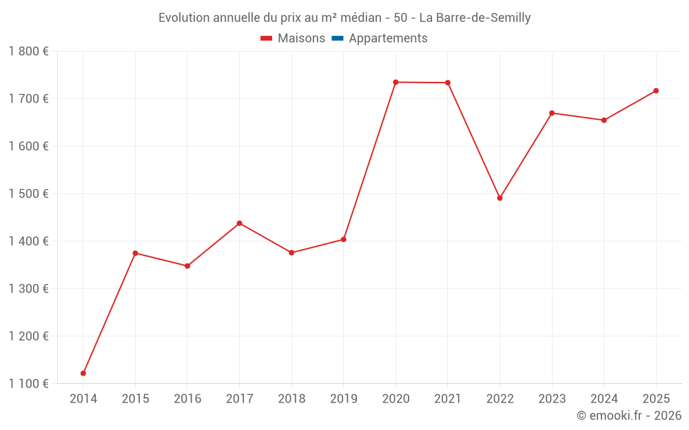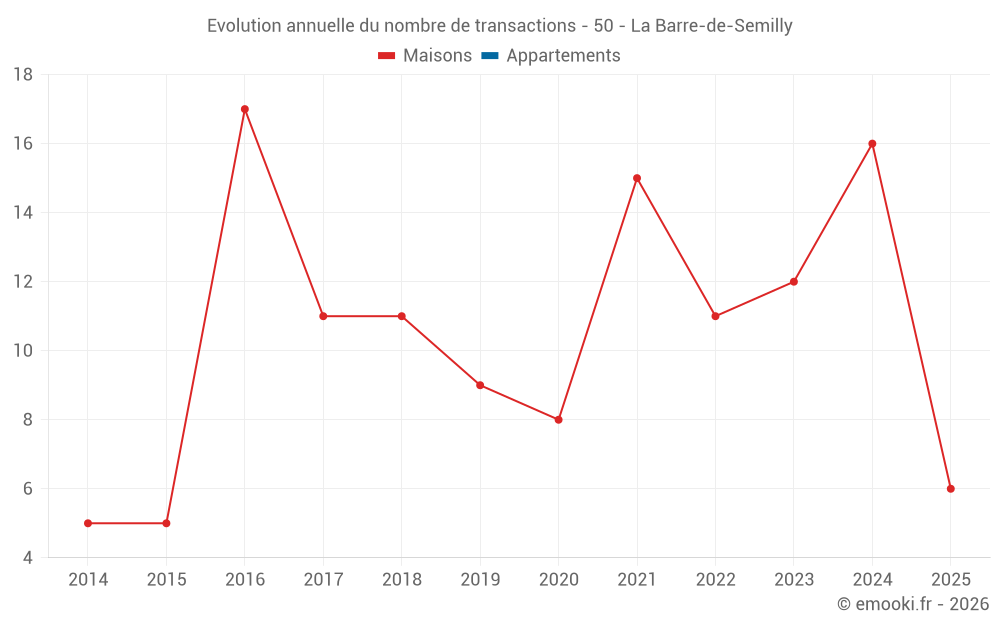 Le prix médian sur les 31 transactions de maisons des 24 derniers mois dans la commune de la Barre-de-Semilly était de 1 607 € par mètre carré pour une valeur foncière médiane de 190 000 €. Sur cette période 60% des transactions se sont situées entre 1 397 et 1 975 € par mètre carré (du 2ème au 8ème déciles).