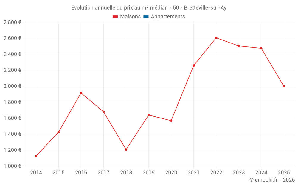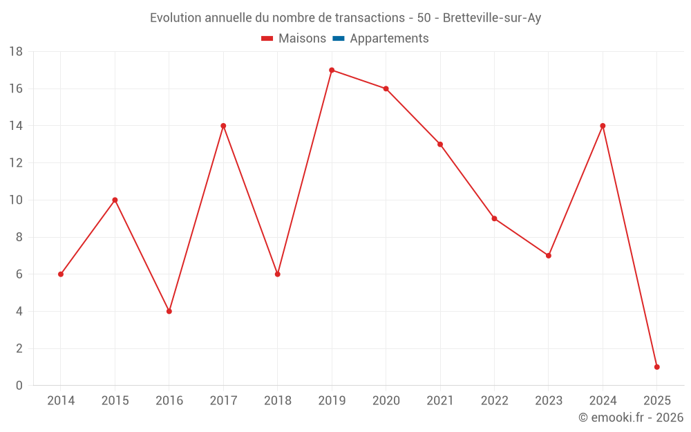 Le prix médian sur les 17 transactions de maisons des 24 derniers mois dans la commune de Bretteville-sur-Ay était de 2 273 € par mètre carré pour une valeur foncière médiane de 175 000 €. Sur cette période 60% des transactions se sont situées entre 1 575 et 3 237 € par mètre carré (du 2ème au 8ème déciles).