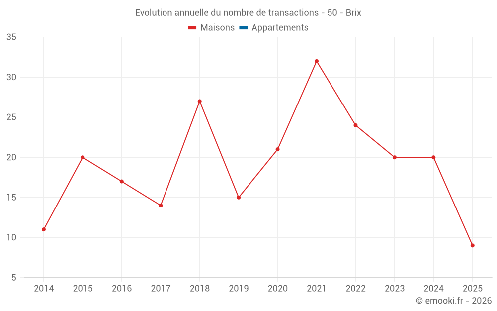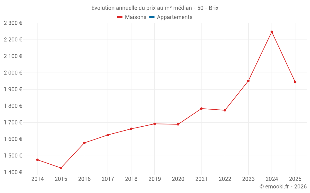 Le prix médian sur les 23 transactions de maisons des 12 derniers mois dans la commune de Brix était de 2 289 € par mètre carré pour une valeur foncière médiane de 210 000 €. Sur cette période 60% des transactions se sont situées entre 1 466 et 2 804 € par mètre carré (du 2ème au 8ème déciles).