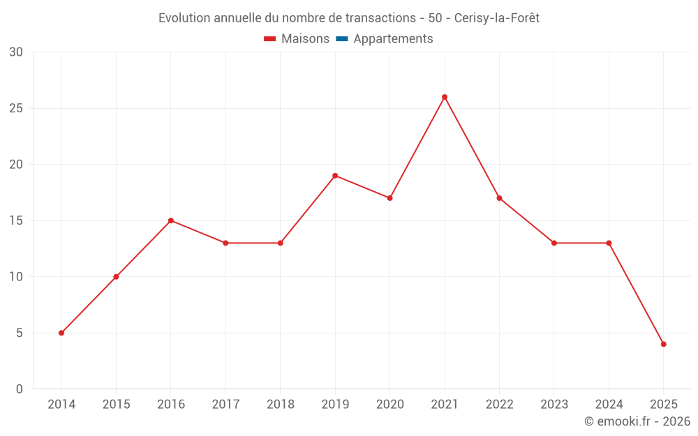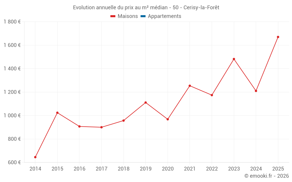 Le prix médian sur les 27 transactions de maisons des 24 derniers mois dans la commune de Cerisy-la-Forêt était de 1 210 € par mètre carré pour une valeur foncière médiane de 110 000 €. Sur cette période 60% des transactions se sont situées entre 959 et 2 143 € par mètre carré (du 2ème au 8ème déciles).