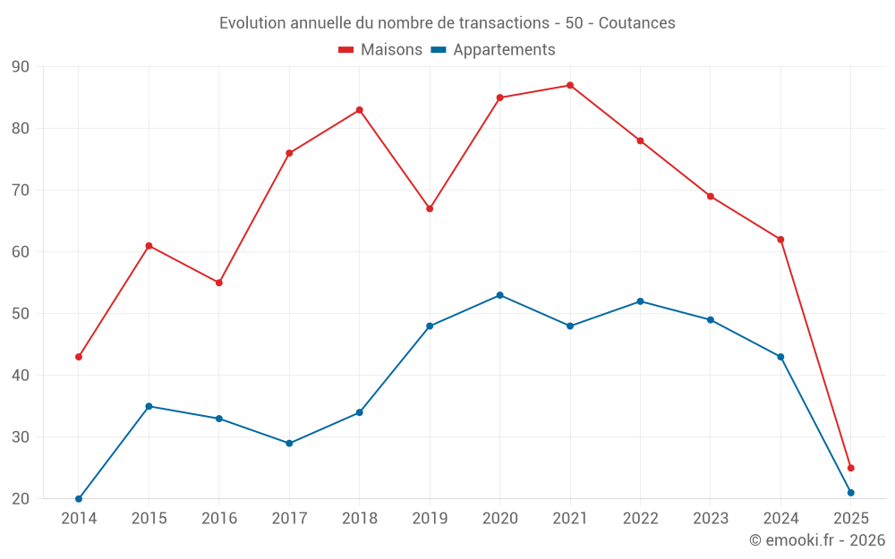 Le prix médian sur les 25 transactions de maisons des 6 derniers mois dans la commune de Coutances était de 1 882 € par mètre carré pour une valeur foncière médiane de 192 600 €. Sur cette période 60% des transactions se sont situées entre 1 401 et 2 651 € par mètre carré (du 2ème au 8ème déciles).