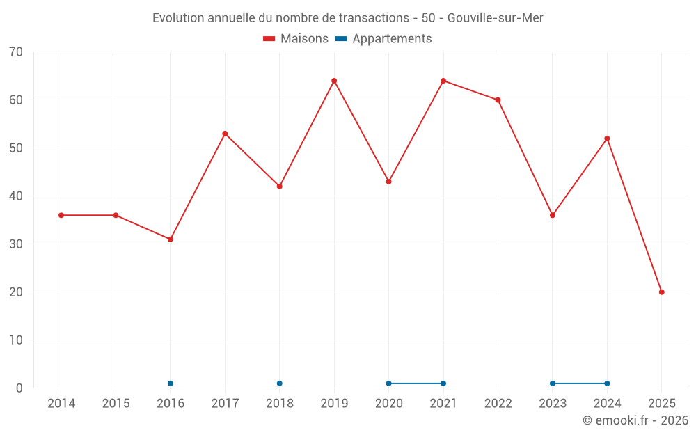 Le prix médian sur les 20 transactions de maisons des 6 derniers mois dans la commune de Gouville-sur-Mer était de 2 886 € par mètre carré pour une valeur foncière médiane de 255 500 €. Sur cette période 60% des transactions se sont situées entre 1 696 et 3 415 € par mètre carré (du 2ème au 8ème déciles).