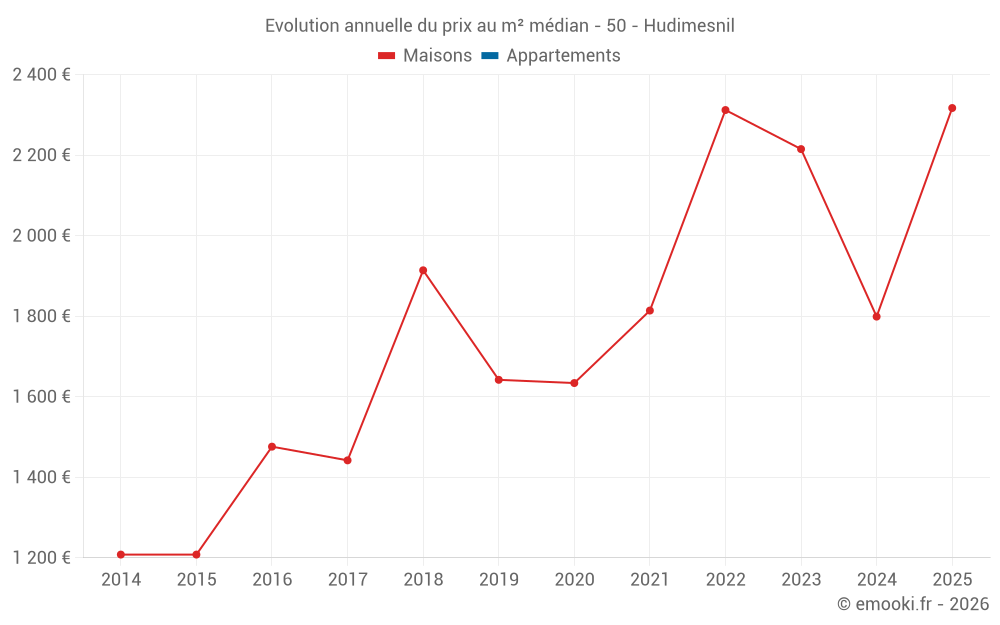 Le prix médian sur les 23 transactions de maisons des 12 derniers mois dans la commune d'Hudimesnil était de 2 094 € par mètre carré pour une valeur foncière médiane de 175 000 €. Sur cette période 60% des transactions se sont situées entre 1 310 et 2 844 € par mètre carré (du 2ème au 8ème déciles).