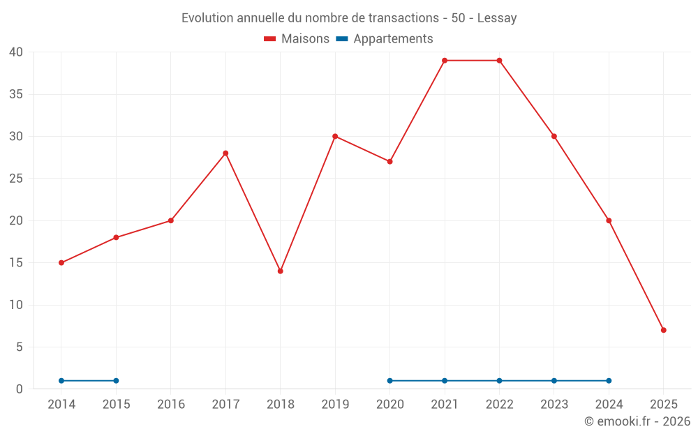 Le prix médian sur les 18 transactions de maisons des 12 derniers mois dans la commune de Lessay était de 1 516 € par mètre carré pour une valeur foncière médiane de 140 000 €. Sur cette période 60% des transactions se sont situées entre 1 050 et 2 126 € par mètre carré (du 2ème au 8ème déciles).