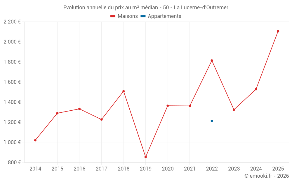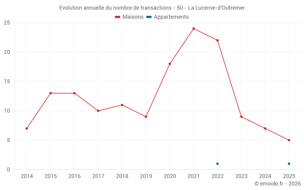 Le prix médian sur les 17 transactions de maisons des 24 derniers mois dans la commune de la Lucerne-d'Outremer était de 1 406 € par mètre carré pour une valeur foncière médiane de 135 000 €. Sur cette période 60% des transactions se sont situées entre 1 102 et 2 208 € par mètre carré (du 2ème au 8ème déciles).