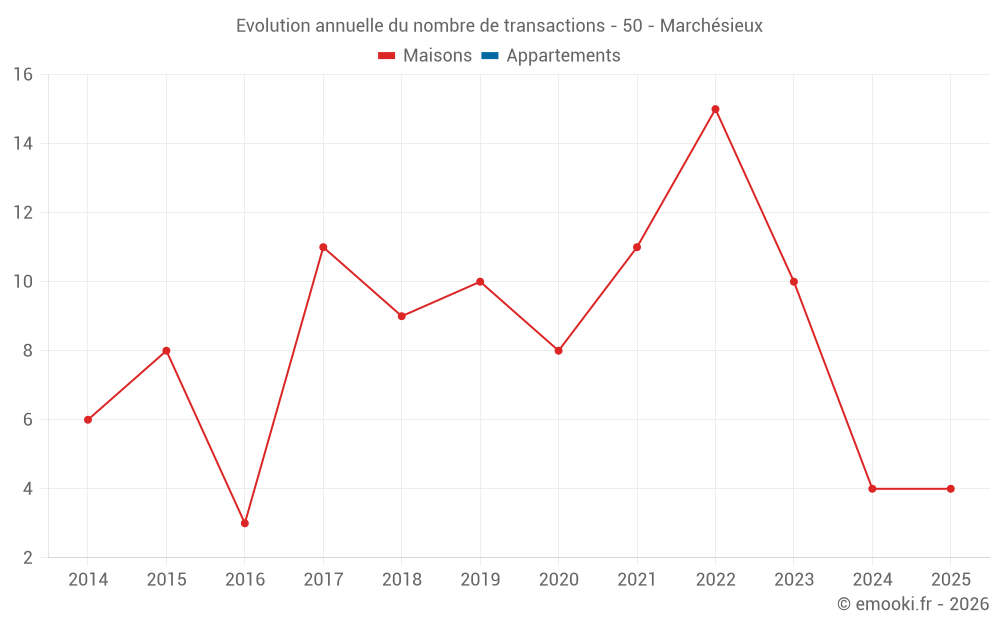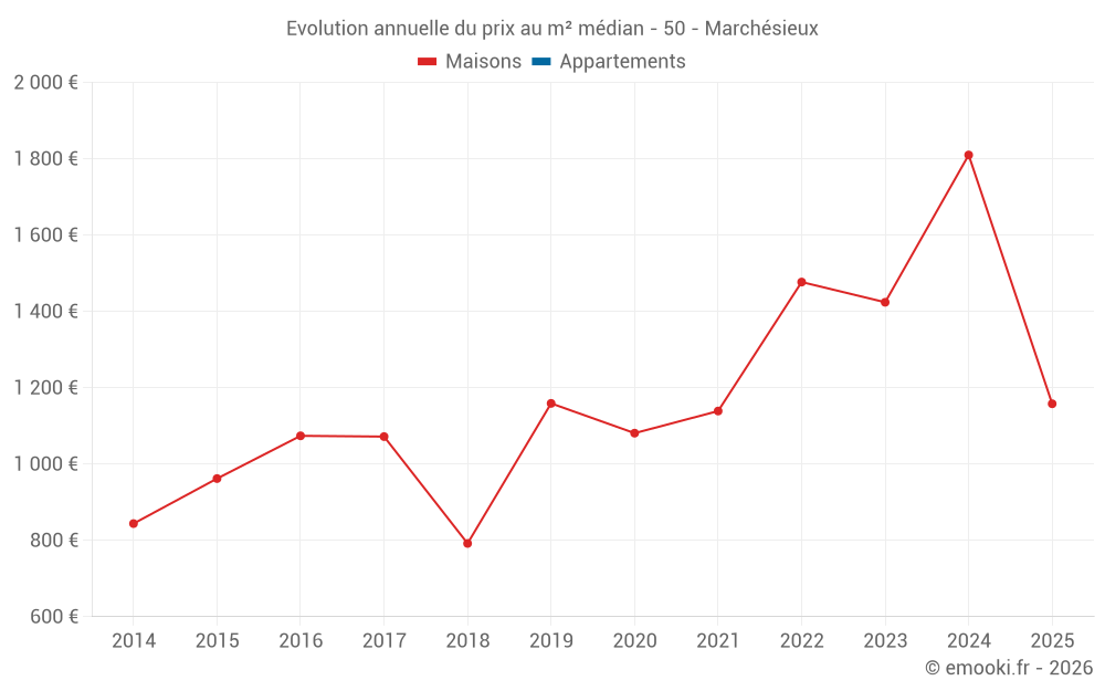Le prix médian sur les 14 transactions de maisons des 24 derniers mois dans la commune de Marchésieux était de 1 542 € par mètre carré pour une valeur foncière médiane de 137 500 €. Sur cette période 60% des transactions se sont situées entre 938 et 1 884 € par mètre carré (du 2ème au 8ème déciles).