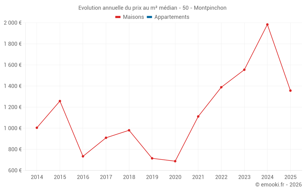 Le prix médian sur les 15 transactions de maisons des 24 derniers mois dans la commune de Montpinchon était de 1 714 € par mètre carré pour une valeur foncière médiane de 144 000 €. Sur cette période 60% des transactions se sont situées entre 806 et 2 023 € par mètre carré (du 2ème au 8ème déciles).