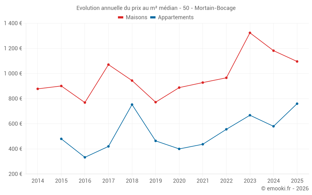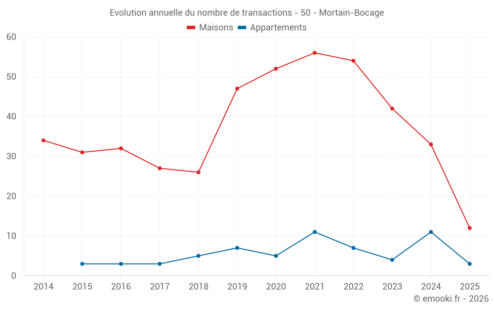 Le prix médian sur les 23 transactions de maisons des 12 derniers mois dans la commune de Mortain-Bocage était de 1 108 € par mètre carré pour une valeur foncière médiane de 92 000 €. Sur cette période 60% des transactions se sont situées entre 678 et 1 407 € par mètre carré (du 2ème au 8ème déciles).