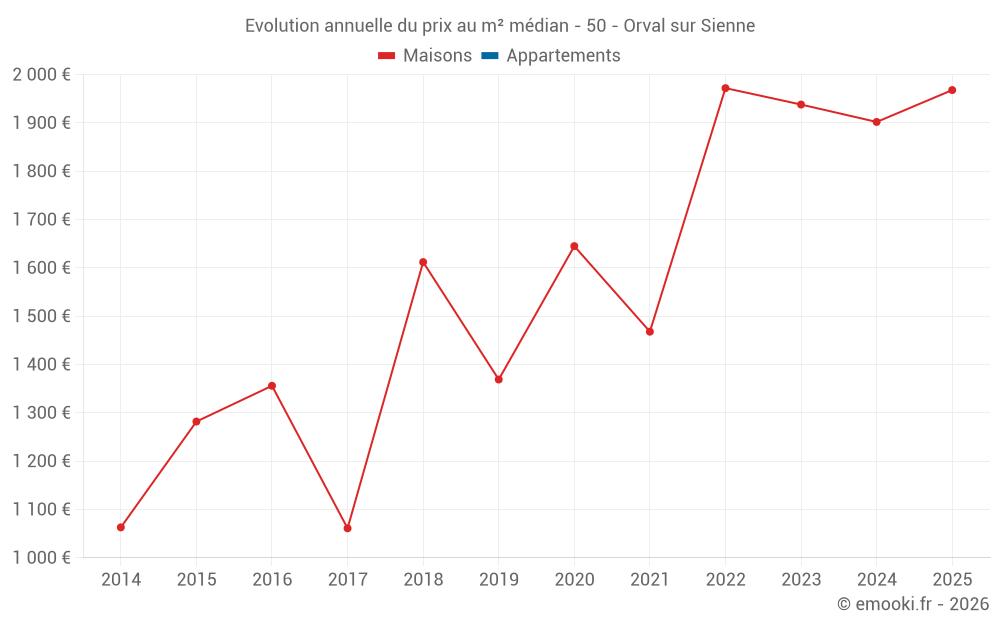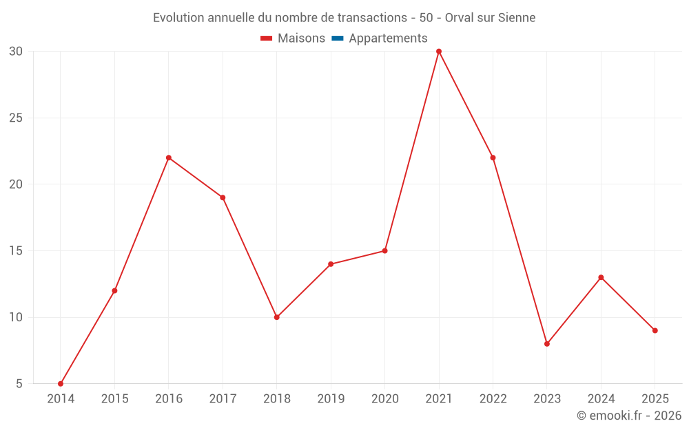 Le prix médian sur les 27 transactions de maisons des 24 derniers mois dans la commune d'Orval sur Sienne était de 1 968 € par mètre carré pour une valeur foncière médiane de 203 000 €. Sur cette période 60% des transactions se sont situées entre 1 136 et 2 580 € par mètre carré (du 2ème au 8ème déciles).