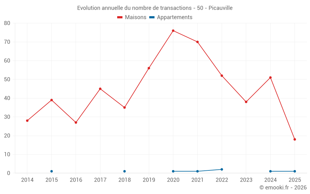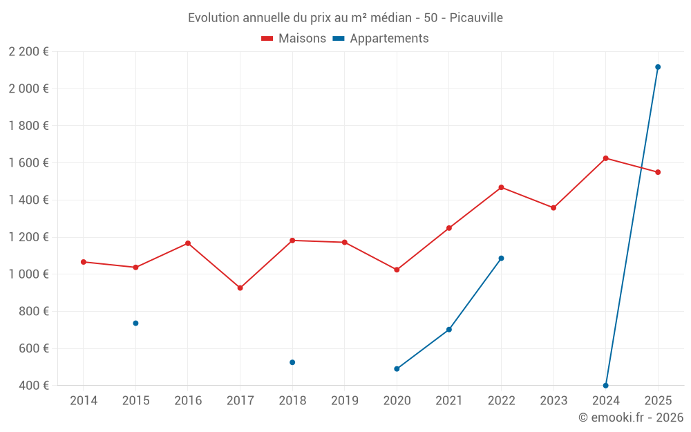 Le prix médian sur les 18 transactions de maisons des 6 derniers mois dans la commune de Picauville était de 1 550 € par mètre carré pour une valeur foncière médiane de 135 000 €. Sur cette période 60% des transactions se sont situées entre 1 058 et 1 903 € par mètre carré (du 2ème au 8ème déciles).