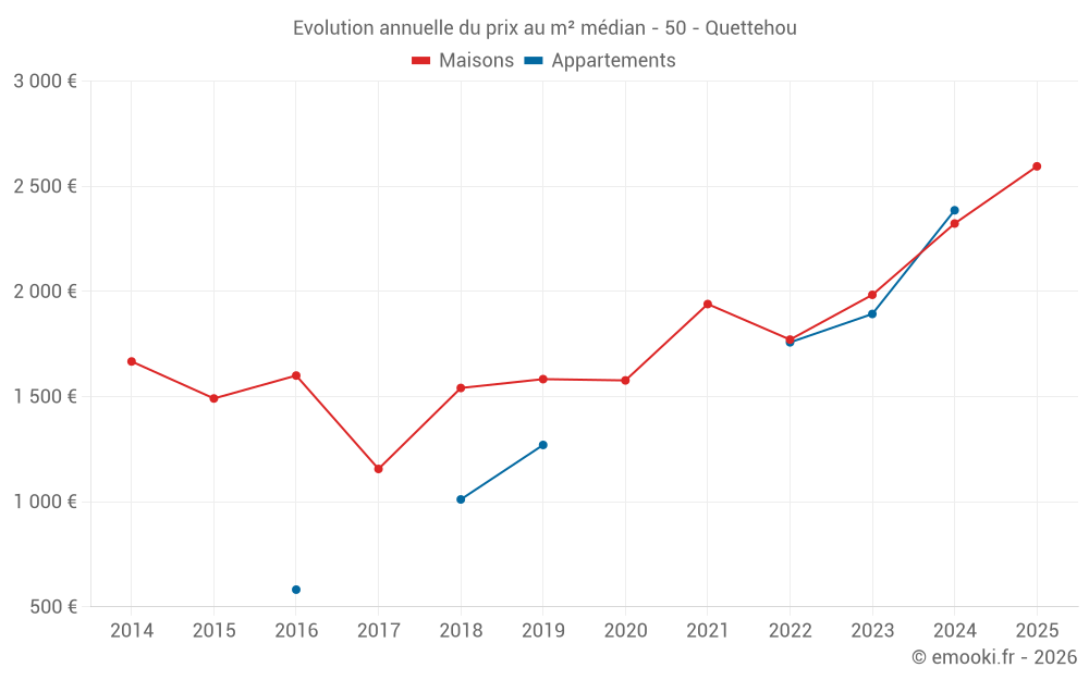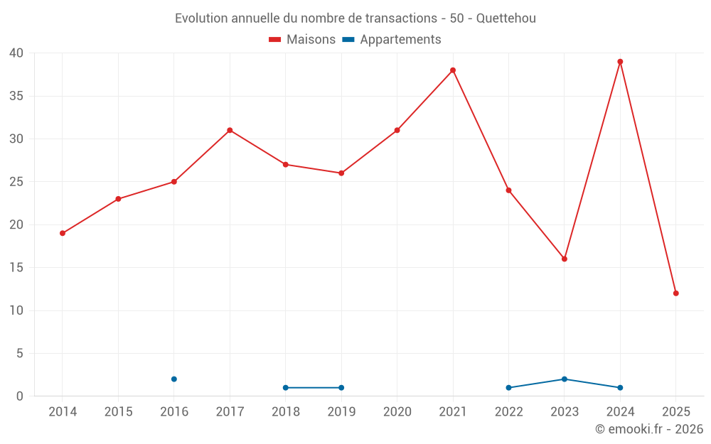 Le prix médian sur les 32 transactions de maisons des 12 derniers mois dans la commune de Quettehou était de 2 636 € par mètre carré pour une valeur foncière médiane de 180 000 €. Sur cette période 60% des transactions se sont situées entre 1 565 et 3 180 € par mètre carré (du 2ème au 8ème déciles).
