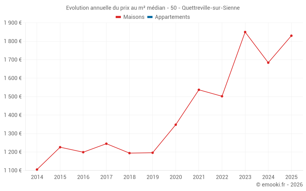 Le prix médian sur les 24 transactions de maisons des 6 derniers mois dans la commune de Quettreville-sur-Sienne était de 1 830 € par mètre carré pour une valeur foncière médiane de 164 500 €. Sur cette période 60% des transactions se sont situées entre 885 et 2 412 € par mètre carré (du 2ème au 8ème déciles).