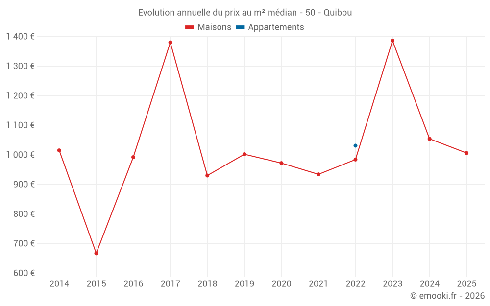 Le prix médian sur les 23 transactions de maisons des 24 derniers mois dans la commune de Quibou était de 1 222 € par mètre carré pour une valeur foncière médiane de 127 000 €. Sur cette période 60% des transactions se sont situées entre 921 et 1 916 € par mètre carré (du 2ème au 8ème déciles).