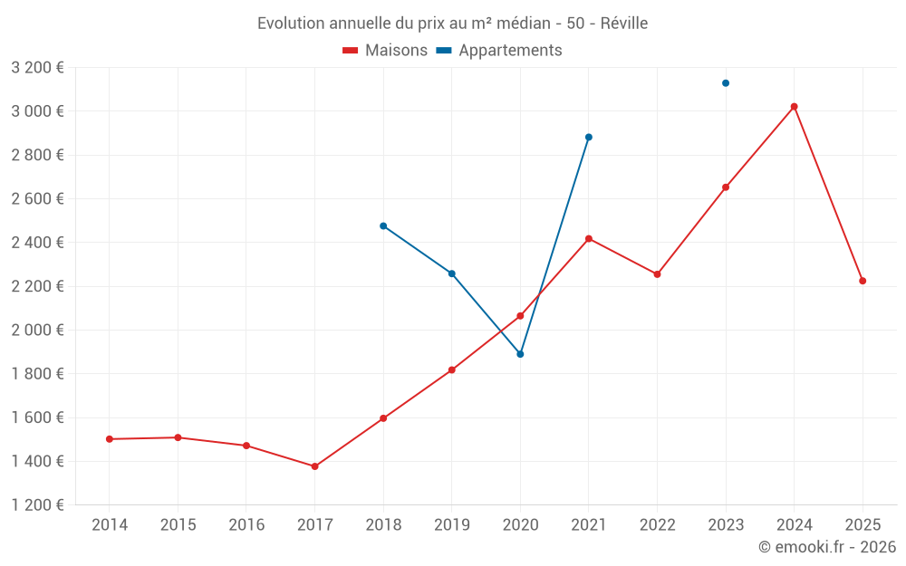 Le prix médian sur les 25 transactions de maisons des 24 derniers mois dans la commune de Réville était de 2 874 € par mètre carré pour une valeur foncière médiane de 231 350 €. Sur cette période 60% des transactions se sont situées entre 1 607 et 4 446 € par mètre carré (du 2ème au 8ème déciles).