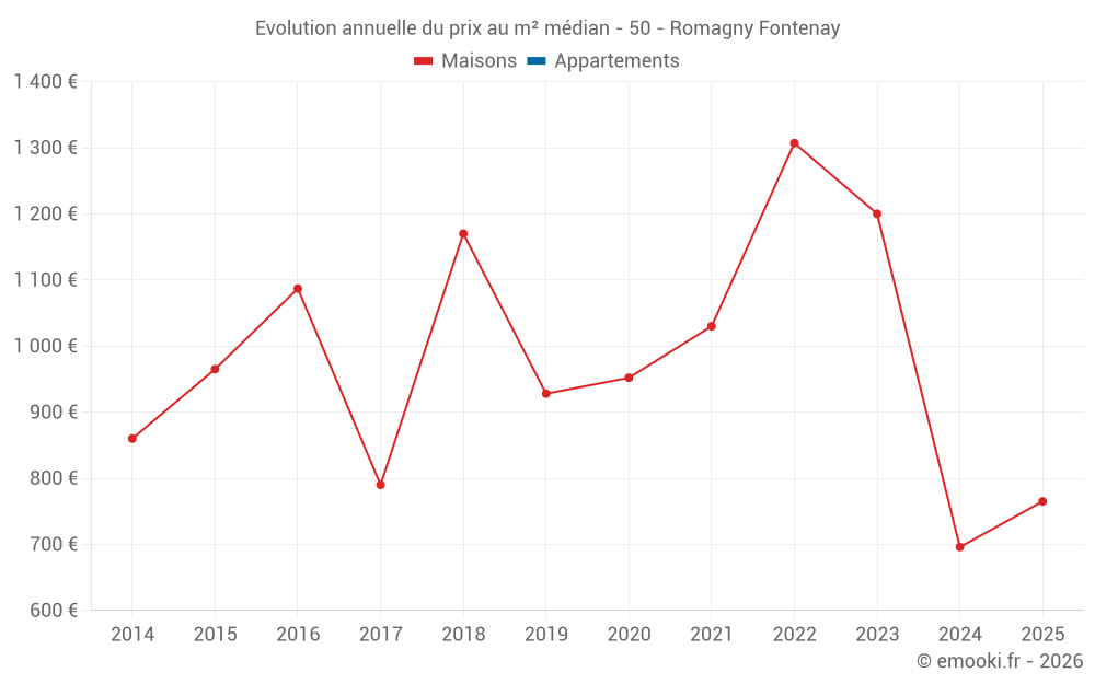 Le prix médian sur les 16 transactions de maisons des 12 derniers mois dans la commune de Romagny Fontenay était de 696 € par mètre carré pour une valeur foncière médiane de 67 500 €. Sur cette période 60% des transactions se sont situées entre 559 et 1 169 € par mètre carré (du 2ème au 8ème déciles).