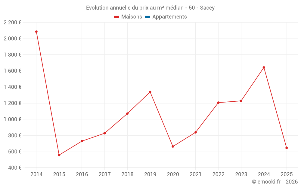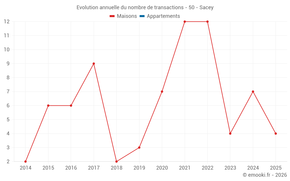 Le prix médian sur les 15 transactions de maisons des 24 derniers mois dans la commune de Sacey était de 958 € par mètre carré pour une valeur foncière médiane de 70 500 €. Sur cette période 60% des transactions se sont situées entre 649 et 1 775 € par mètre carré (du 2ème au 8ème déciles).