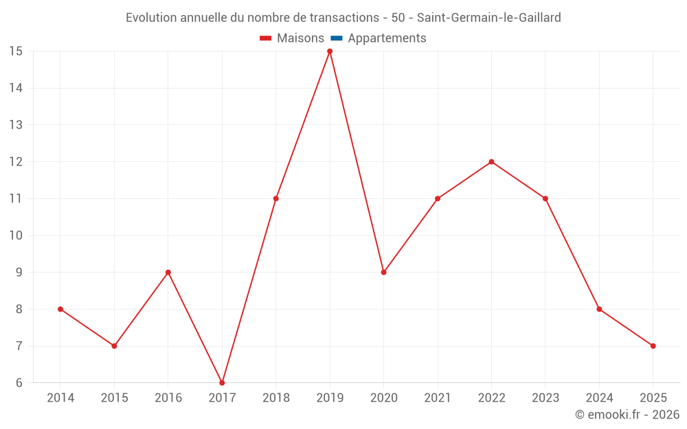 Le prix médian sur les 21 transactions de maisons des 24 derniers mois dans la commune de Saint-Germain-le-Gaillard était de 2 193 € par mètre carré pour une valeur foncière médiane de 193 000 €. Sur cette période 60% des transactions se sont situées entre 1 705 et 2 583 € par mètre carré (du 2ème au 8ème déciles).