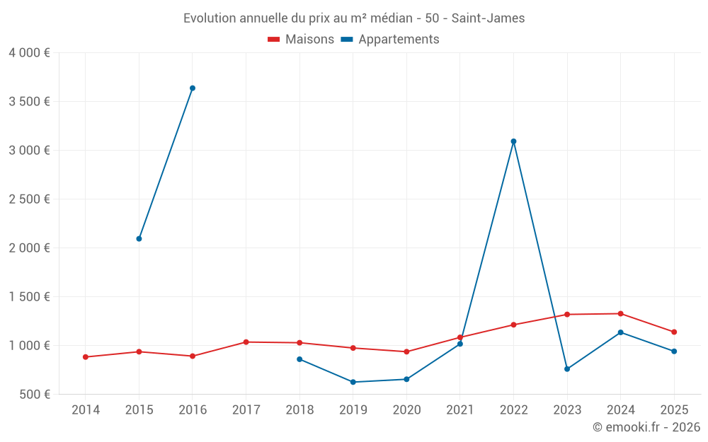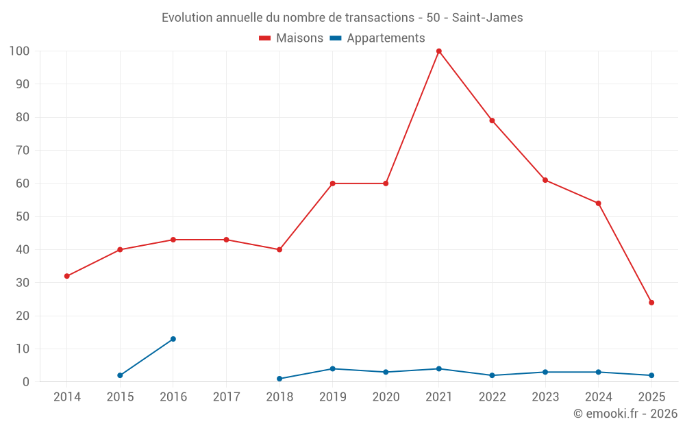 Le prix médian sur les 24 transactions de maisons des 6 derniers mois dans la commune de Saint-James était de 1 140 € par mètre carré pour une valeur foncière médiane de 83 750 €. Sur cette période 60% des transactions se sont situées entre 634 et 1 831 € par mètre carré (du 2ème au 8ème déciles).