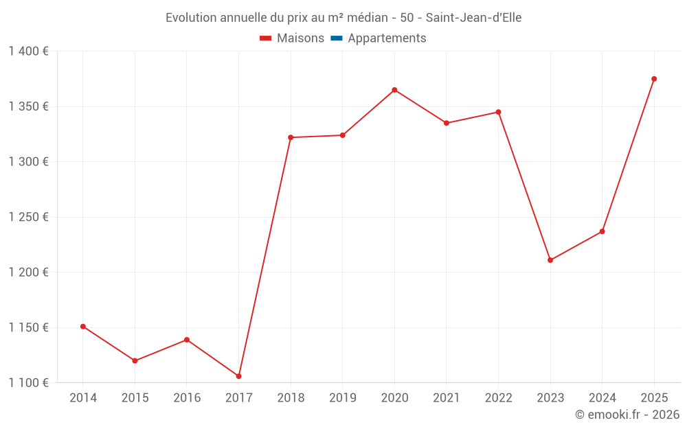 Le prix médian sur les 29 transactions de maisons des 12 derniers mois dans la commune de Saint-Jean-d'Elle était de 1 375 € par mètre carré pour une valeur foncière médiane de 118 500 €. Sur cette période 60% des transactions se sont situées entre 878 et 1 728 € par mètre carré (du 2ème au 8ème déciles).