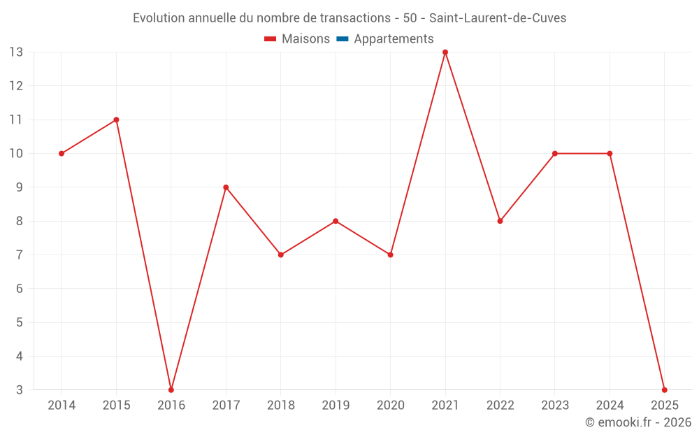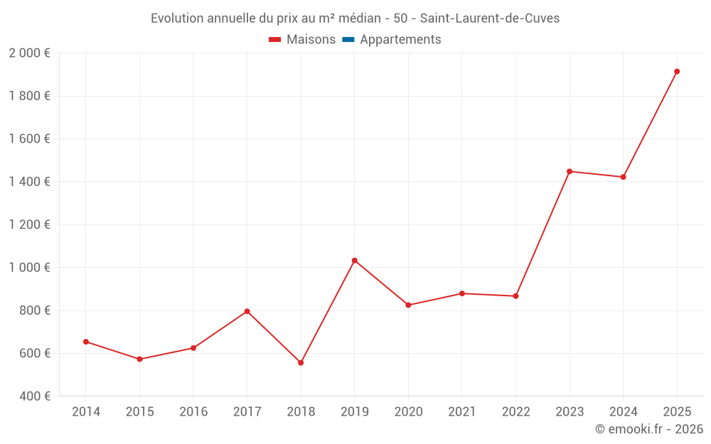 Le prix médian sur les 18 transactions de maisons des 24 derniers mois dans la commune de Saint-Laurent-de-Cuves était de 1 500 € par mètre carré pour une valeur foncière médiane de 140 000 €. Sur cette période 60% des transactions se sont situées entre 1 277 et 2 076 € par mètre carré (du 2ème au 8ème déciles).