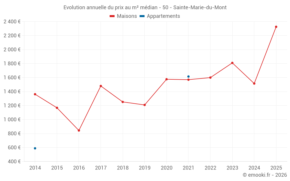 Le prix médian sur les 17 transactions de maisons des 24 derniers mois dans la commune de Sainte-Marie-du-Mont était de 1 839 € par mètre carré pour une valeur foncière médiane de 153 000 €. Sur cette période 60% des transactions se sont situées entre 1 264 et 2 306 € par mètre carré (du 2ème au 8ème déciles).