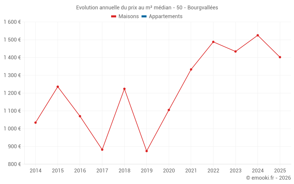 Le prix médian sur les 26 transactions de maisons des 12 derniers mois dans la commune de Bourgvallées était de 1 572 € par mètre carré pour une valeur foncière médiane de 156 500 €. Sur cette période 60% des transactions se sont situées entre 1 190 et 2 063 € par mètre carré (du 2ème au 8ème déciles).