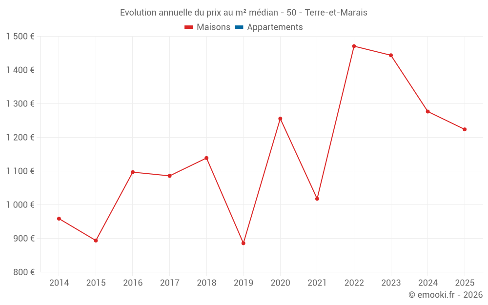 Le prix médian sur les 16 transactions de maisons des 12 derniers mois dans la commune de Terre-et-Marais était de 1 376 € par mètre carré pour une valeur foncière médiane de 156 500 €. Sur cette période 60% des transactions se sont situées entre 885 et 1 738 € par mètre carré (du 2ème au 8ème déciles).
