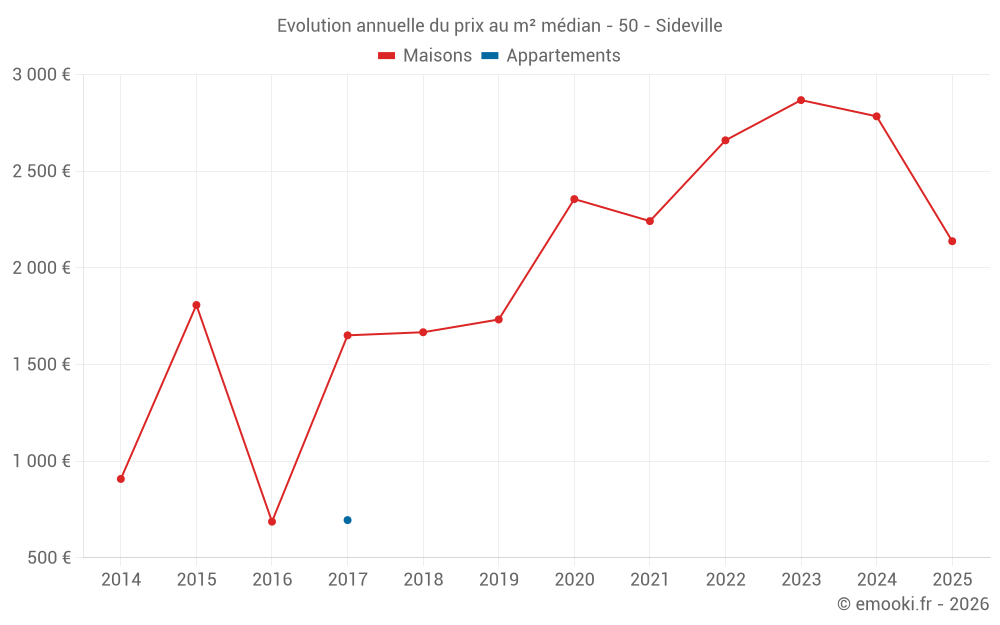 Le prix au m² des maisons a diminué de 23% depuis 1 an, mais il a augmenté de 211% en 9 ans.