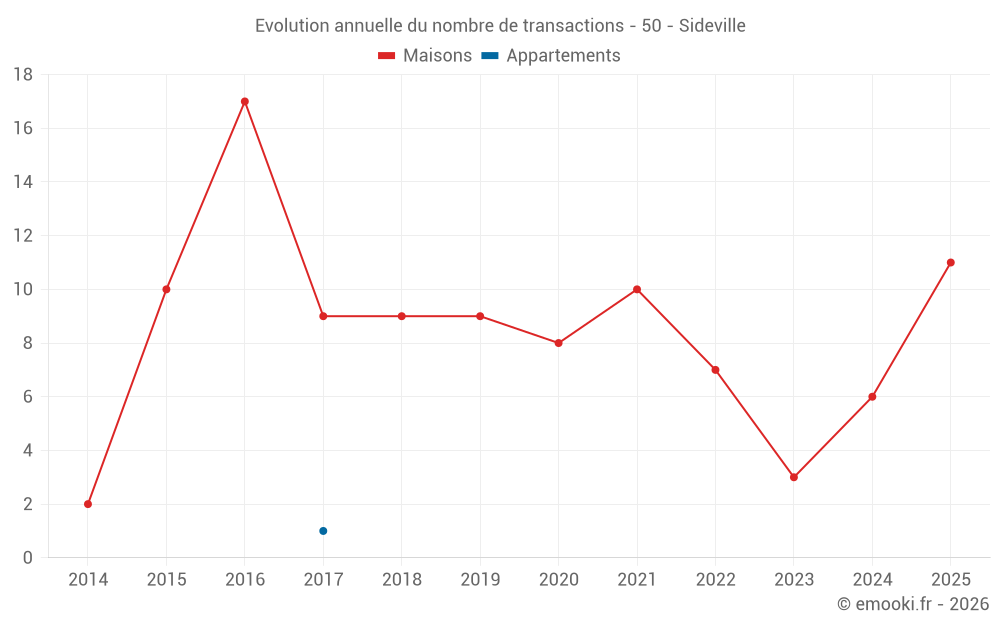 Le prix médian sur les 17 transactions de maisons des 24 derniers mois dans la commune de Sideville était de 2 500 € par mètre carré pour une valeur foncière médiane de 265 000 €. Sur cette période 60% des transactions se sont situées entre 1 902 et 2 813 € par mètre carré (du 2ème au 8ème déciles).