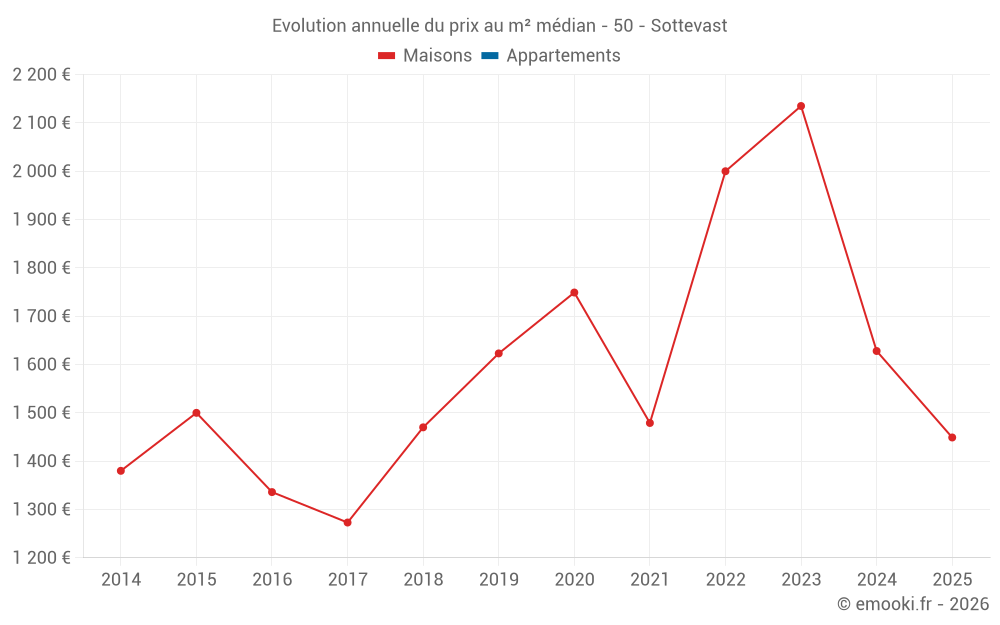 Le prix médian sur les 27 transactions de maisons des 24 derniers mois dans la commune de Sottevast était de 1 681 € par mètre carré pour une valeur foncière médiane de 225 000 €. Sur cette période 60% des transactions se sont situées entre 1 288 et 2 442 € par mètre carré (du 2ème au 8ème déciles).