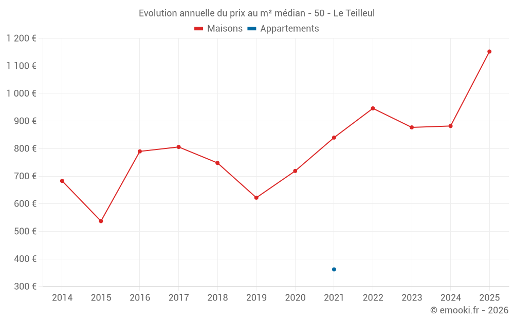 Le prix médian sur les 24 transactions de maisons des 12 derniers mois dans la commune du Teilleul était de 1 080 € par mètre carré pour une valeur foncière médiane de 91 100 €. Sur cette période 60% des transactions se sont situées entre 556 et 1 663 € par mètre carré (du 2ème au 8ème déciles).