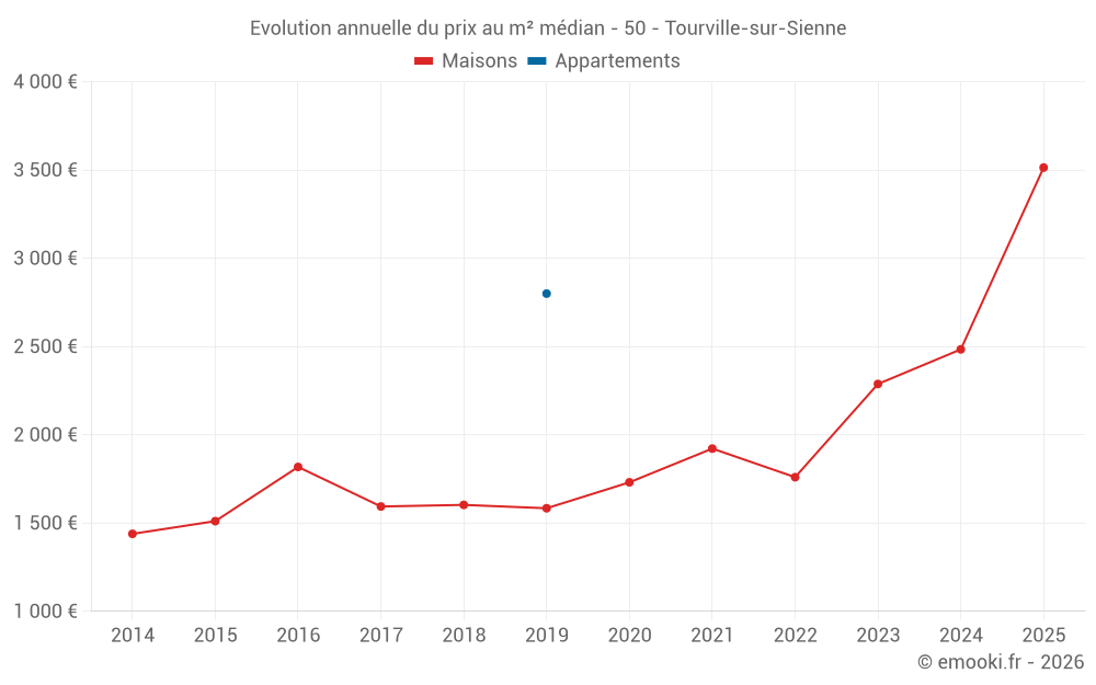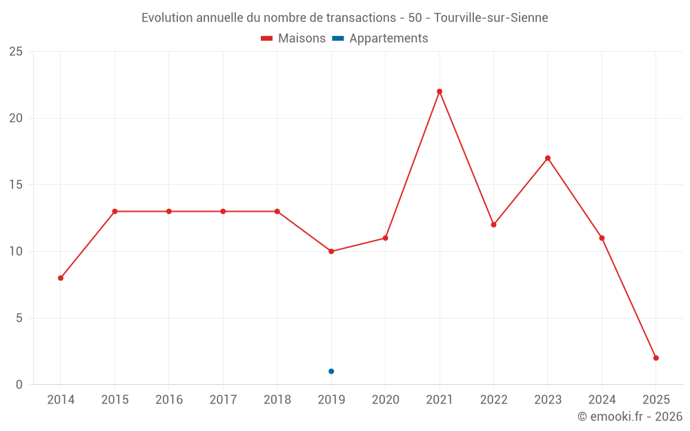 Le prix médian sur les 22 transactions de maisons des 24 derniers mois dans la commune de Tourville-sur-Sienne était de 2 442 € par mètre carré pour une valeur foncière médiane de 281 000 €. Sur cette période 60% des transactions se sont situées entre 2 085 et 2 942 € par mètre carré (du 2ème au 8ème déciles).