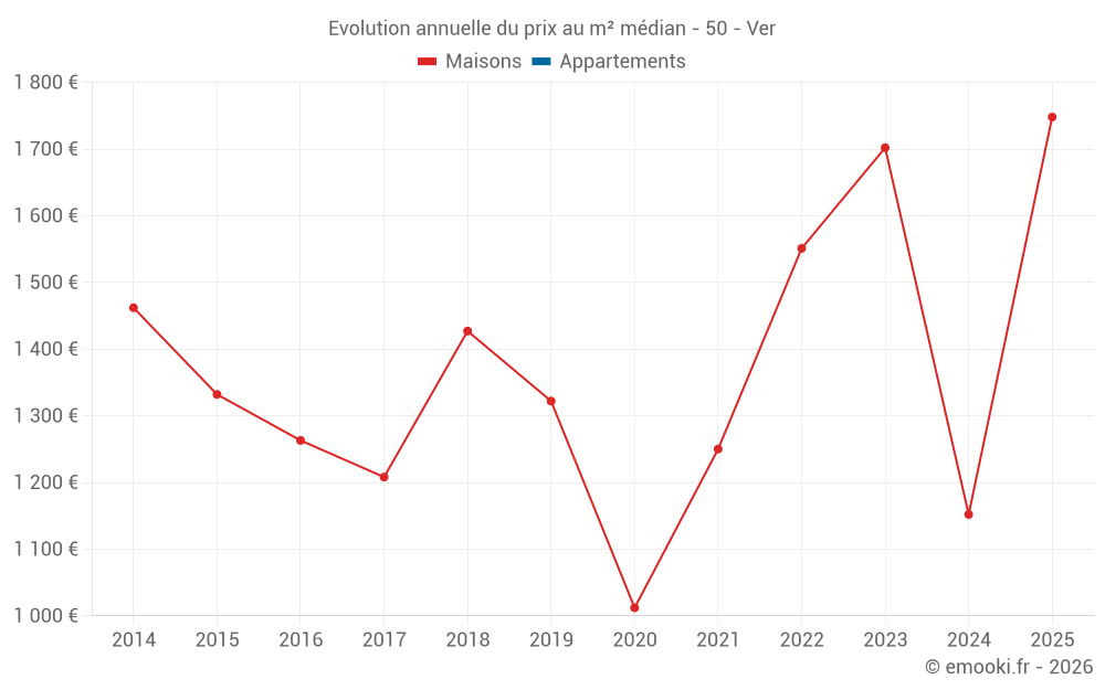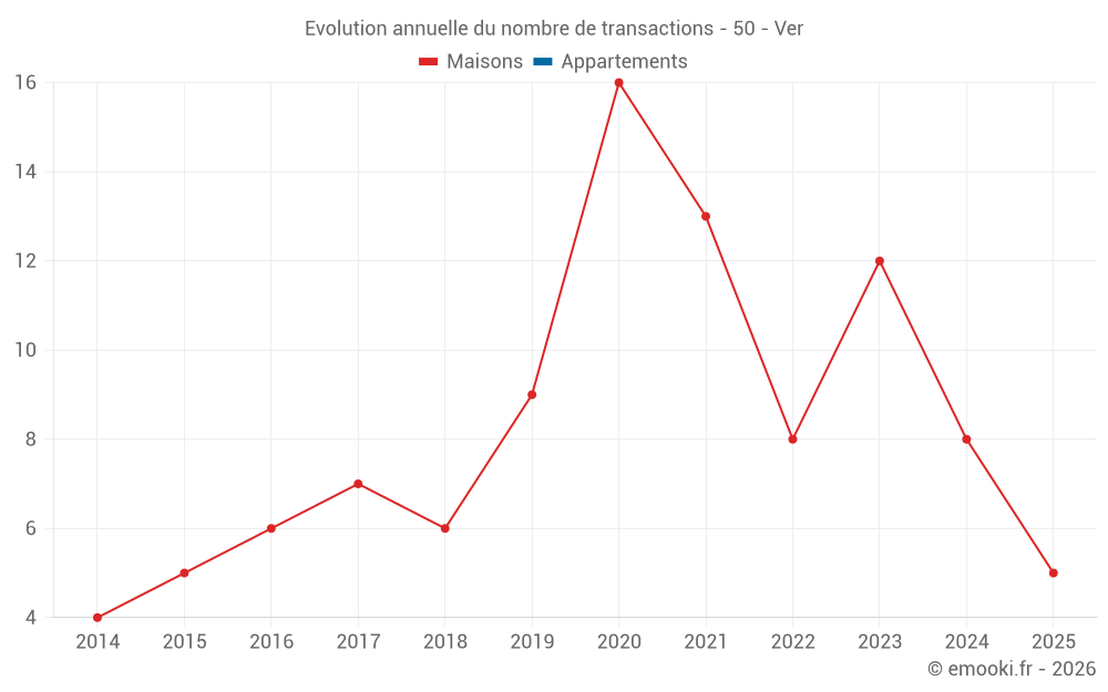 Le prix médian sur les 17 transactions de maisons des 24 derniers mois dans la commune de Ver était de 1 553 € par mètre carré pour une valeur foncière médiane de 104 000 €. Sur cette période 60% des transactions se sont situées entre 966 et 1 997 € par mètre carré (du 2ème au 8ème déciles).