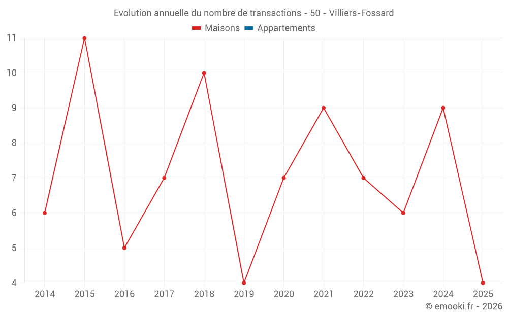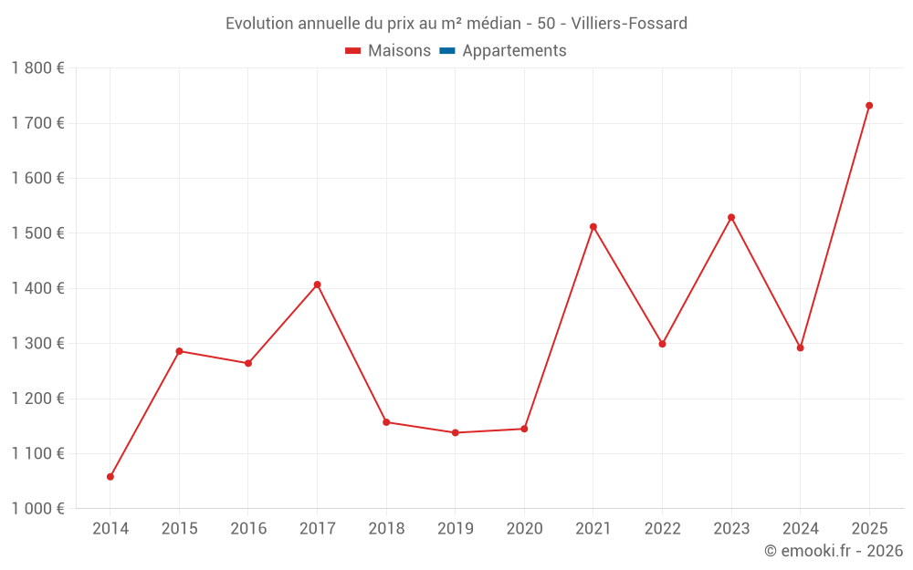 Le prix médian sur les 14 transactions de maisons des 24 derniers mois dans la commune de Villiers-Fossard était de 1 360 € par mètre carré pour une valeur foncière médiane de 158 000 €. Sur cette période 60% des transactions se sont situées entre 1 027 et 1 873 € par mètre carré (du 2ème au 8ème déciles).