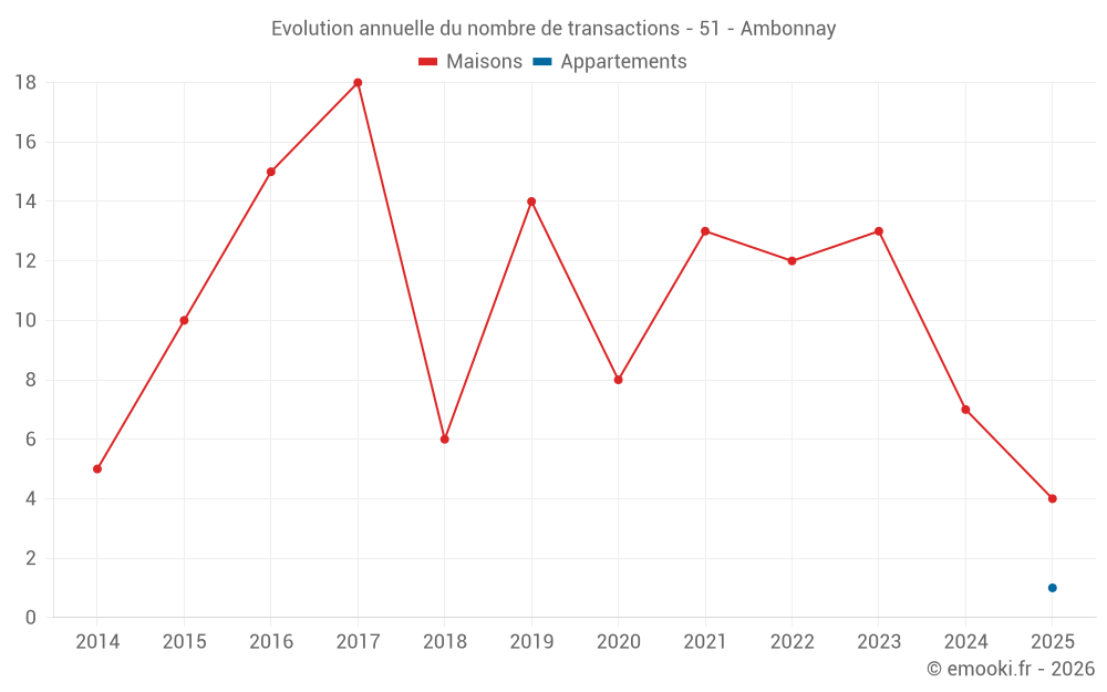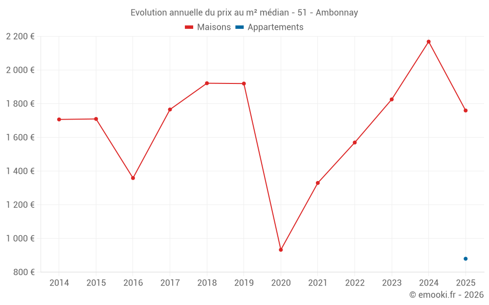 Le prix médian sur les 19 transactions de maisons des 24 derniers mois dans la commune d'Ambonnay était de 1 925 € par mètre carré pour une valeur foncière médiane de 175 000 €. Sur cette période 60% des transactions se sont situées entre 1 546 et 2 312 € par mètre carré (du 2ème au 8ème déciles).