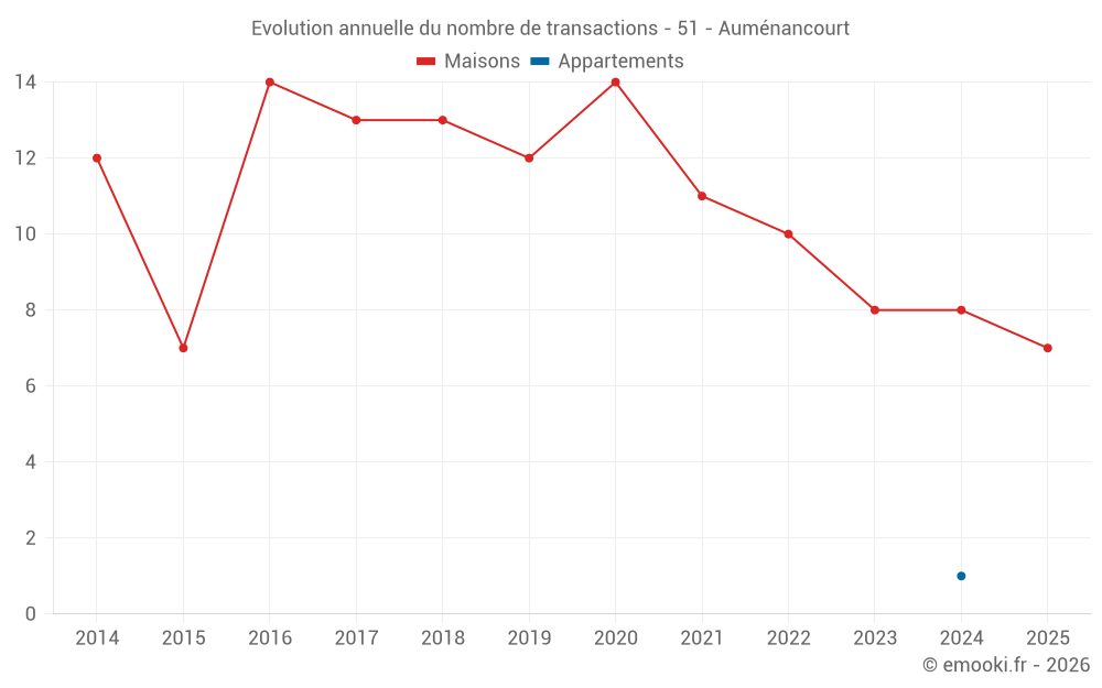 Le prix médian sur les 20 transactions de maisons des 24 derniers mois dans la commune d'Auménancourt était de 2 240 € par mètre carré pour une valeur foncière médiane de 218 250 €. Sur cette période 60% des transactions se sont situées entre 1 467 et 2 566 € par mètre carré (du 2ème au 8ème déciles).
