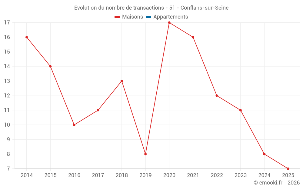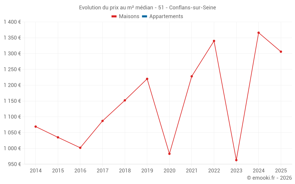 Le prix médian sur les 17 transactions de maisons des 24 derniers mois dans la commune de Conflans-sur-Seine était de 1 281 € par mètre carré pour une valeur foncière médiane de 126 000 €. Sur cette période 60% des transactions se sont situées entre 947 et 1 437 € par mètre carré (du 2ème au 8ème déciles).