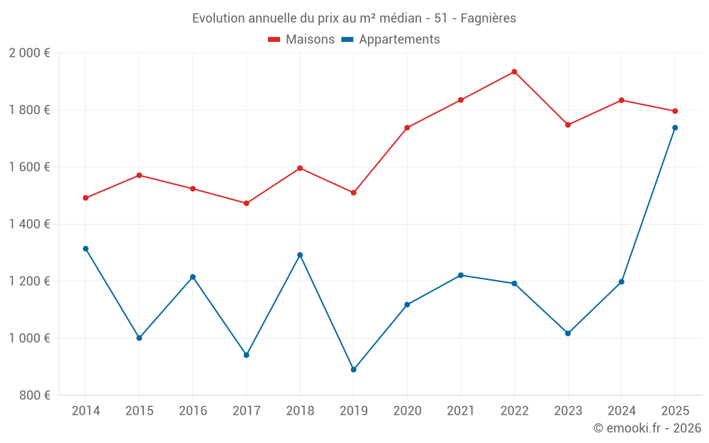 Le prix médian sur les 24 transactions de maisons des 12 derniers mois dans la commune de Fagnières était de 1 834 € par mètre carré pour une valeur foncière médiane de 179 500 €. Sur cette période 60% des transactions se sont situées entre 1 590 et 2 127 € par mètre carré (du 2ème au 8ème déciles).