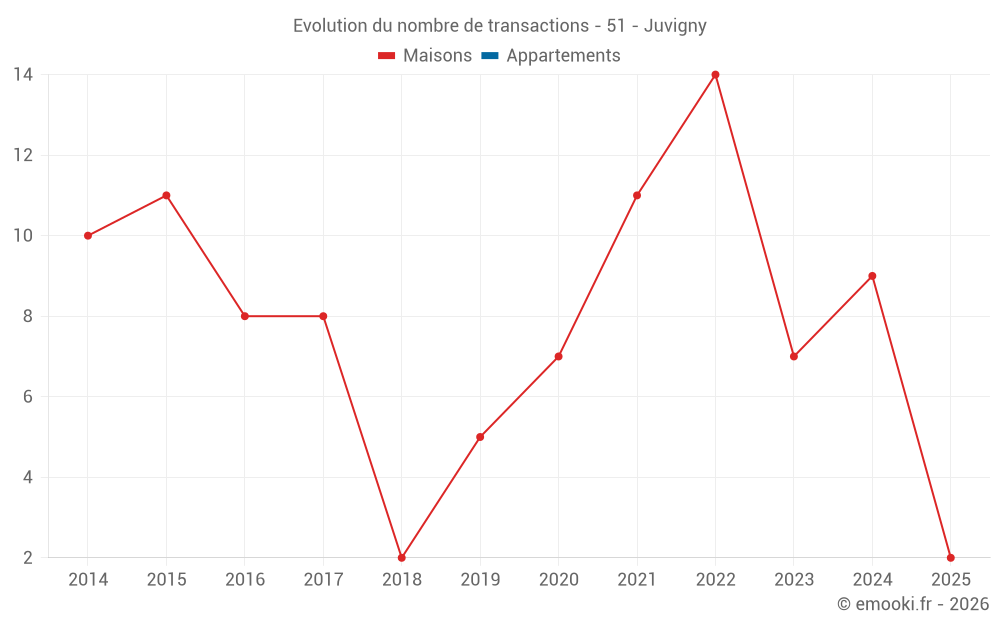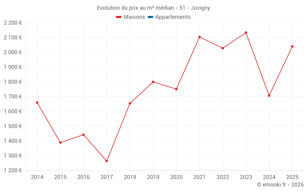 Le prix médian sur les 16 transactions de maisons des 24 derniers mois dans la commune de Juvigny était de 2 040 € par mètre carré pour une valeur foncière médiane de 197 250 €. Sur cette période 60% des transactions se sont situées entre 1 485 et 2 335 € par mètre carré (du 2ème au 8ème déciles).
