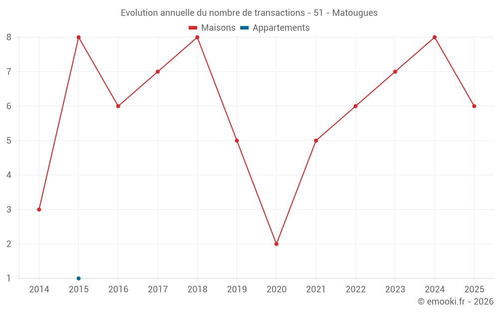 Le prix médian sur les 18 transactions de maisons des 24 derniers mois dans la commune de Matougues était de 1 980 € par mètre carré pour une valeur foncière médiane de 174 500 €. Sur cette période 60% des transactions se sont situées entre 1 767 et 2 285 € par mètre carré (du 2ème au 8ème déciles).