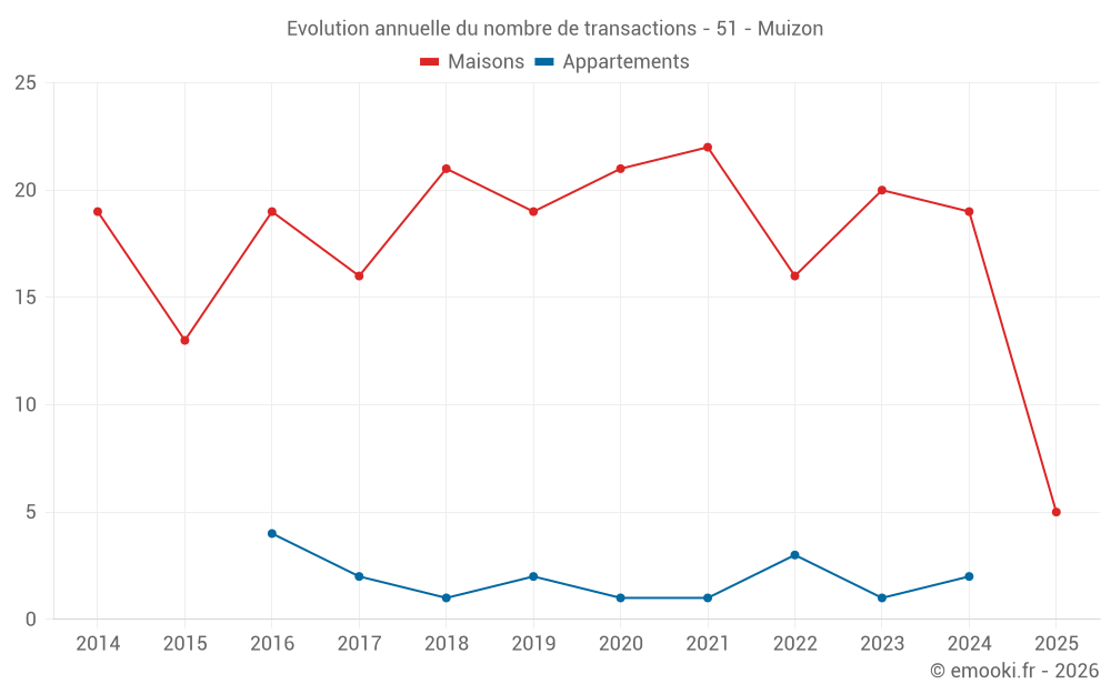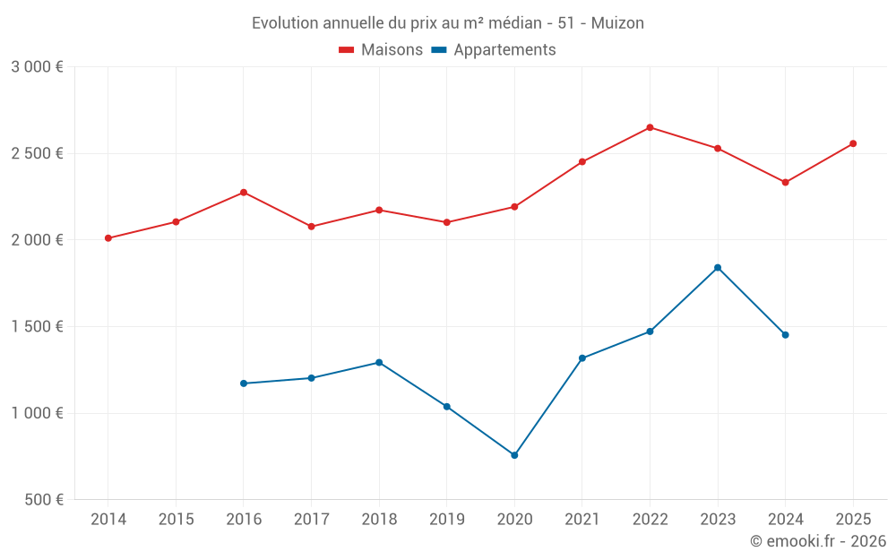 Le prix médian sur les 34 transactions de maisons des 24 derniers mois dans la commune de Muizon était de 2 426 € par mètre carré pour une valeur foncière médiane de 227 750 €. Sur cette période 60% des transactions se sont situées entre 2 049 et 2 766 € par mètre carré (du 2ème au 8ème déciles).