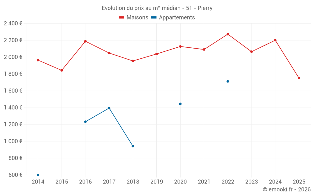Le prix médian sur les 26 transactions de maisons des 24 derniers mois dans la commune de Pierry était de 2 107 € par mètre carré pour une valeur foncière médiane de 189 000 €. Sur cette période 60% des transactions se sont situées entre 1 642 et 2 389 € par mètre carré (du 2ème au 8ème déciles).